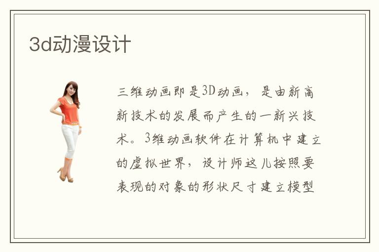 三维动画即是3D动画,是由新高新技术的发展而产生的一新兴技术。3维动画软件在计算机中建立的虚拟世界,设计师这儿按照要表现的对象的形状尺寸建立模型以及场景,根据要求设定的运动轨迹、虚拟摄影机的运动和其它动画参数,最后按要求为模型赋上特定的材质,并打上灯光。当这一切完成后就可以让计算机自动运算,生成最后的画面。