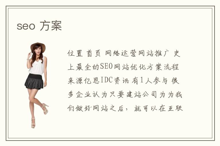 位置 首页 >网络运营>网站推广> 史上最全的SEO网站优化方案流程 来源亿恩IDC资讯 有1人参与 很多企业认为只要建站公司为为我们做好网站之后,就可以在互联网上打造品