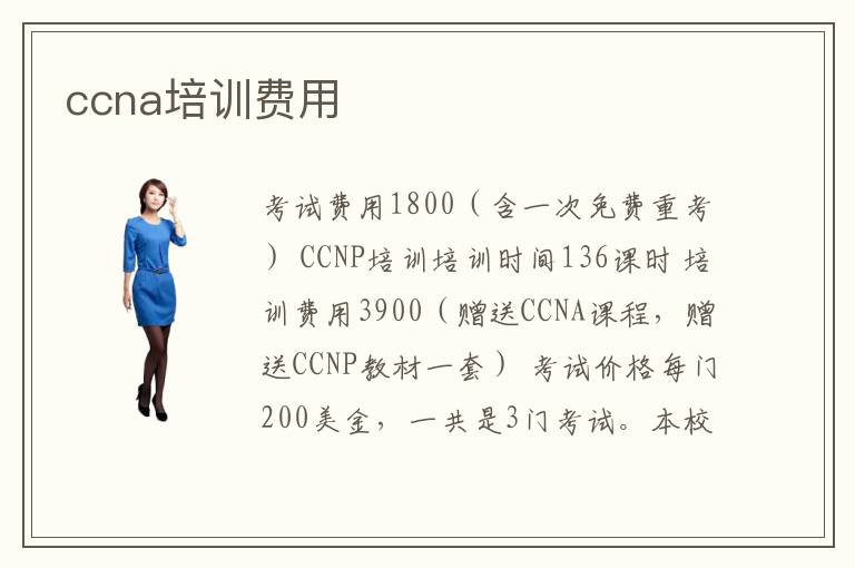 考试费用1800(含一次免费重考) CCNP培训培训时间136课时 培训费用3900(赠送CCNA课程,赠送CCNP教材一套) 考试价格每门200美金,一共是3门考试。本校