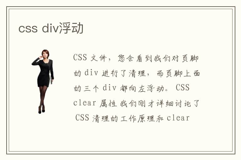 CSS 文件,您会看到我们对页脚的 div 进行了清理,而页脚上面的三个 div 都向左浮动。 CSS clear 属性 我们刚才详细讨论了 CSS 清理的工作原理和 clear 属性应用方法。如果您
