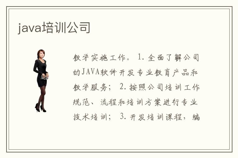 教学实施工作。 1.全面了解公司的JAVA软件开发专业教育产品和教学服务; 2.按照公司培训工作规范、流程和培训方案进行专业技术培训; 3.开发培训课程,编制培训课件和完善