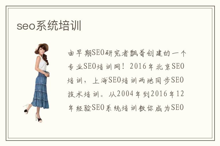 由早期SEO研究者飘哥创建的一个专业SEO培训网!2016年北京SEO培训,上海SEO培训两地同步SEO技术培训。从2004年到2016年12年经验SEO系统培训教你成为SEO高手!