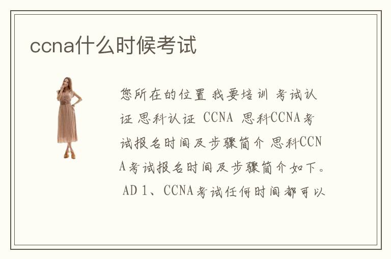 您所在的位置 我要培训 >考试认证 >思科认证 > CCNA > 思科CCNA考试报名时间及步骤简介 思科CCNA考试报名时间及步骤简介如下。 AD 1、CCNA考试任何时间都可以报名