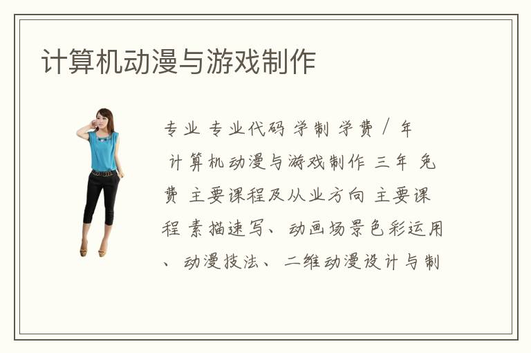 专业 专业代码 学制 学费 / 年 计算机动漫与游戏制作 三年 免费 主要课程及从业方向 主要课程 素描速写、动画场景色彩运用、动漫技法、二维动漫设计与制作、三维 动漫设计与制