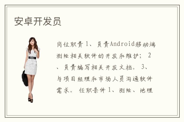 岗位职责 1、负责Android移动端测绘相关软件的开发和维护; 2、负责编写相关开发文档。 3、与项目经理和市场人员沟通软件需求。 任职条件 1、测绘、地理信息系统等相关
