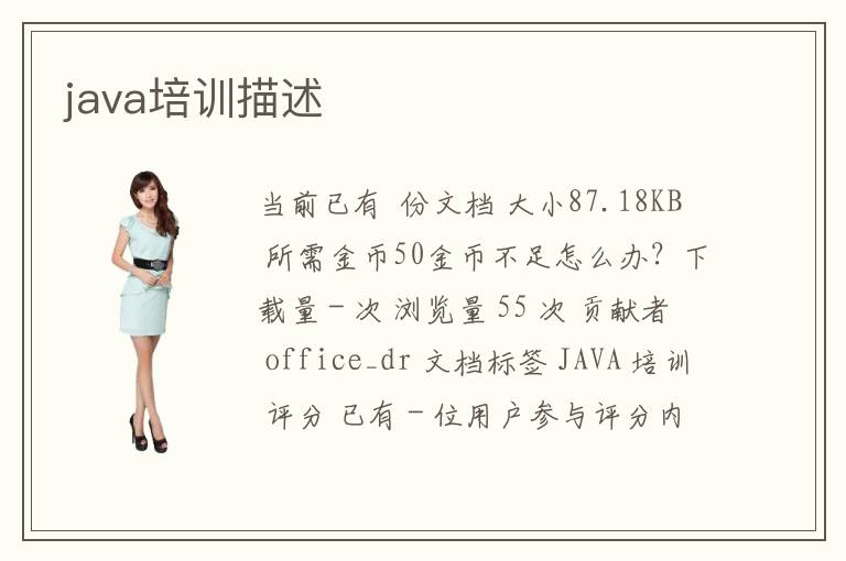 当前已有 份文档 大小87.18KB 所需金币50金币不足怎么办?下载量 - 次 浏览量 55 次 贡献者 office_dr 文档标签 JAVA 培训 评分 已有 - 位用户参与评分