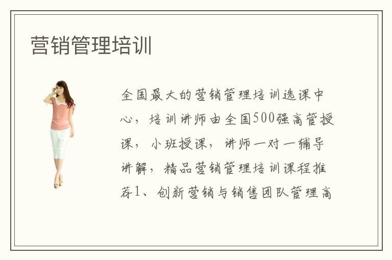 全国最大的营销管理培训选课中心,培训讲师由全国500强高管授课,小班授课,讲师一对一辅导讲解,精品营销管理培训课程推荐1、创新营销与销售团队管理高级研修班--销售