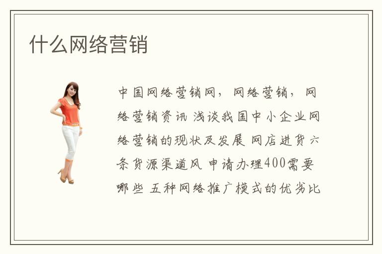 中国网络营销网,网络营销,网络营销资讯 浅谈我国中小企业网络营销的现状及发展 网店进货六条货源渠道风 申请办理400需要哪些 五种网络推广模式的优劣比较 什么是搜