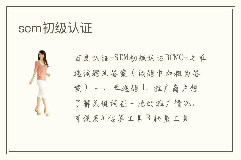 欢迎来到百度SEM初级认证考试试题在线测试,每日更新最新题库,方便进行自我评测,详细讲解每一道模拟题,助你顺利通过百度初级认证考试。