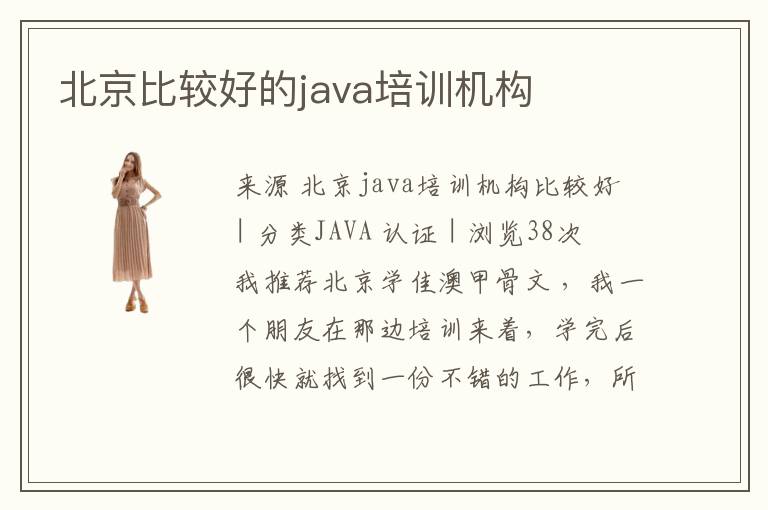 来源 北京java培训机构比较好 | 分类JAVA 认证 | 浏览38次 我推荐北京学佳澳甲骨文 ,我一个朋友在那边培训来着,学完后很快就找到一份不错的工作,所以个人认为那里应该