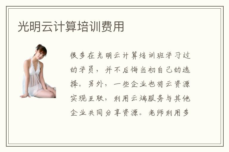 很多在光明云计算培训班学习过的学员,并不后悔当初自己的选择。另外,一些企业也将云资源实现互联,利用云端服务与其他企业共同分享资源。老师利用多年经验,为大家一一讲解,应该可以减轻同学的负担。云计算采用的是虚拟的技术,将大量的数据集中在云端,要是用户需要使用,就可以从云端搜索出来,满足日常的使用,因此这些技术能够赢得众多技术人员的青睐,也可以服务广大的网民朋友。传授给学员的知识都是专业知识。云计算技术人员前景吗,云计算技术人员前景非常好,可以从事很多种技术方向,比如大数据运维,数据挖掘,机器学习,人工智能等等。而如果是基础性的课程,其实大多数都比较相似,可能在2500到5000元就可以完成。一定可以找到一份工资待遇都不错的工作。