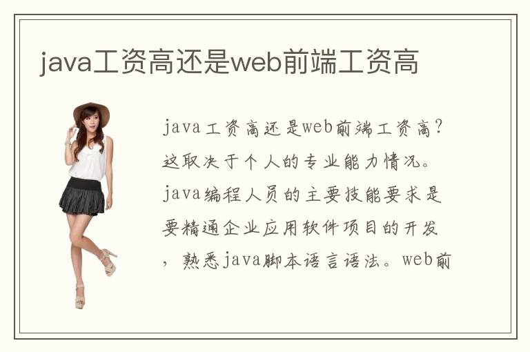 java工资高还是web前端工资高?这取决于个人的专业能力情况。java编程人员的主要技能要求是要精通企业应用软件项目的开发,熟悉java脚本语言语法。web前端工程师的主要工作就是充分利用web各项技术进行产品的界面开发,完善产品软件的互动性。web前端设计开发与JAVA编程设计工资比对有什么不一样的地方呢?java工资水平高吗?web前端工资水平高吗?