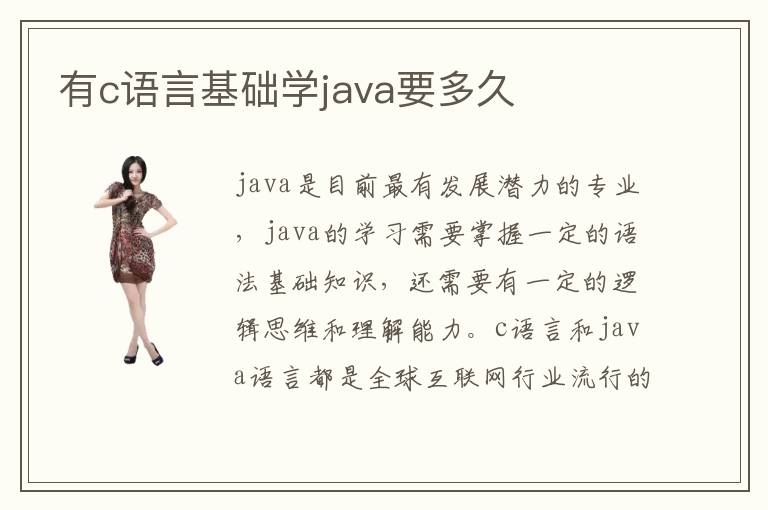 java是目前最有发展潜力的专业,java的学习需要掌握一定的语法基础知识,还需要有一定的逻辑思维和理解能力。c语言和java语言都是全球互联网行业流行的编程语言,不仅在软件开发方面有着广泛的应用,在各大网站页面的设计方面也是前景广泛。各大企业都想要设计自己的网站,因此就需要大批优秀的java工程师。然而一些学过c语言的人也想要开始学习java,那么有c语言基础学java还需要学习多久呢?