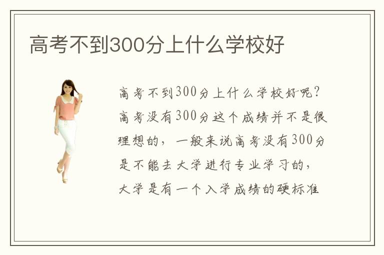 高考不到300分上什么学校好呢?高考没有300分这个成绩并不是很理想的,一般来说高考没有300分是不能去大学进行专业学习的,大学是有一个入学成绩的硬标准的,因此高考不到300分也就不能上大学了。那么,高考不到300分上什么学校好呢?现在有很多大专技术培训学校成立起来,这些大专技术培训学校通常是高考落榜学生们进行专业学习的平台,因此高考不到300分可以上大专。