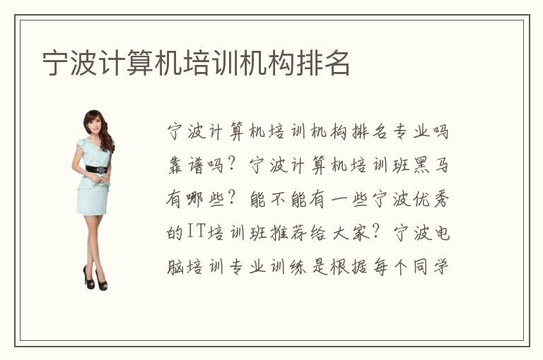 选择一家靠谱的专业计算机培训机构并不是一件简单的事,宁波计算机培训排名是学生选择专业计算机培训机构时的重要参考依据,宁波计算机培训排名根据各大宁波地区的专业计算机培训机构的综合实力,包括计算机培训机构的口碑、师资力量以及教学质量等方面,进行反复比较、不断筛选而得出的结果,是多方面考虑实地考察而得出的结果。