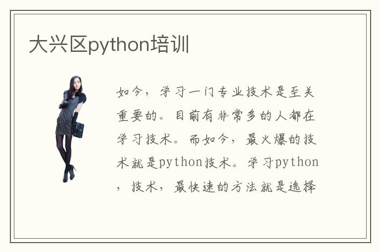 如今,学习一门专业技术是至关重要的。目前有非常多的人都在学习技术。而如今,最火爆的技术就是python技术。学习python,技术,最快速的方法就是选择到专业的培训班里面去学习。大兴区python,培训班就是非常专业。在这里面学习可以学到非常多的专业知识。而且大兴区python,培训班,学习环境非常的好。特别适合学习。学习起来,python技术,非常的轻松。也可以掌握的非常多的专业知识。在工作方面有更多的选择。与别人竞争也比较有优势。想要把python,技术学好的话,就选择到大兴区python培训python培训班。很多在大兴区pyton,培训班里面学习过的学员,都学到了专业知识。现在也都取得了,不错的成就。
