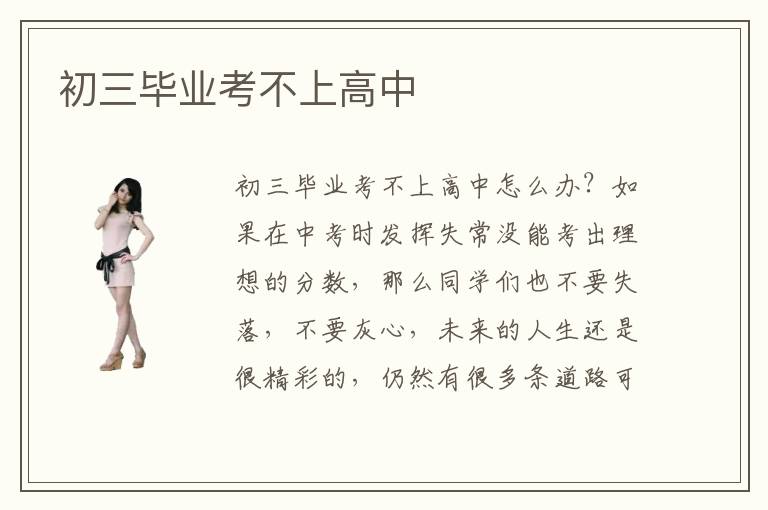 初三毕业考不上高中怎么办?如果在中考时发挥失常没能考出理想的分数,那么同学们也不要失落,不要灰心,未来的人生还是很精彩的,仍然有很多条道路可供同学们选择。首先,初三毕业考不上高中,不要先急着进入社会工作。因为这个年龄段社会经验为零,中学文凭在求职时根本不具备竞争力,找不到什么好工作的。最好是选择学习一门谋生技能。考不上高中还能上学吗?答案是肯定的。可以考虑以下几种方法:一、如果只是一次没有发挥好,那么不妨再复读一次初三。二、应届初中毕业生正好可以读职业高中。正符合职业高中的招生要求。三、可以读中专。中专的主要方向在于相关专业技能的培训,所以对学生的成绩要求不高,入学门槛较低。四。、职业技术学校。到职业技术学校学习一门技能,立足社会。这是目前大家选择最多的几种方法,同学们可根据自己的情况,考虑选择。