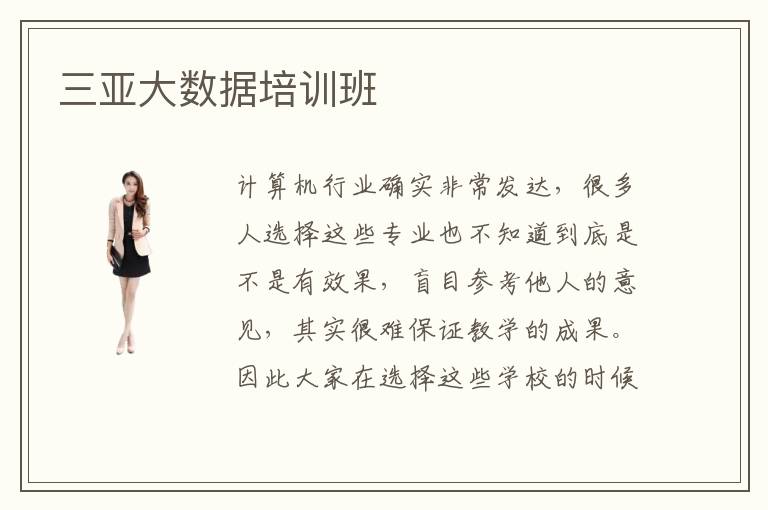 计算机行业确实非常发达,很多人选择这些专业也不知道到底是不是有效果,盲目参考他人的意见,其实很难保证教学的成果。因此大家在选择这些学校的时候,要尤为关心学校的优缺点,教学的成果,每个学校可能出现的副作用等等。三亚大数据培训班就业有没有优势,很多培训班毕业的学生,在学成之日找工作,还是相当有优势的,因为这些学生的实践动手能力越来越强,培养出比较先进的思维,发展更快。三亚大数据培训大数据培训班环境好吗,大多数培训班的环境还是非常优越的,教育水平比较好,而且有些学校能针对不同的学生水平,采用合适的培养方案。三亚大数据培训班没钱行不行,一般情况下培训班的费用都不是特别贵,可能需要准备花2000元到1万元钱,要看选择的课程是高端还是低端。