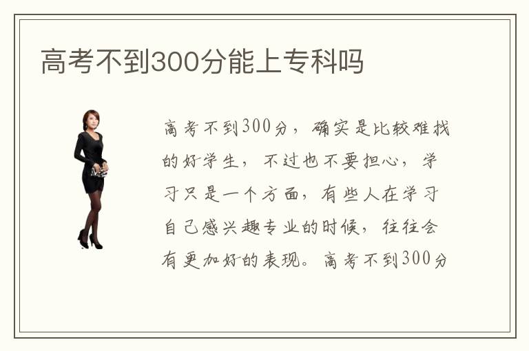 高考不到300分,确实是比较难找的好学生,不过也不要担心,学习只是一个方面,有些人在学习自己感兴趣专业的时候,往往会有更加好的表现。高考不到300分能上专科吗大专正规吗,300分左右其实读大专还是有好处的,比如更加适合就业,学习一技之长,未来找工作更简单。有些人可能就是吸取教训,珍惜读大专的机会,因此进行专升本,又能提高自身学历。高考不到300分能上专科吗怎么挑选学校,高考不到300分上专科其实也是有作用的,因为有些专科院校的实力还是相当不错,如果学生在读完之后有事业编制的可能或者是考公务员,研究生等等,当然前提条件是要有足够的专业能力。有些学生可能并没有这样的实力,优势也不太明显,所以大家要努力,不断突破自己,这样才会拥有更多机会。