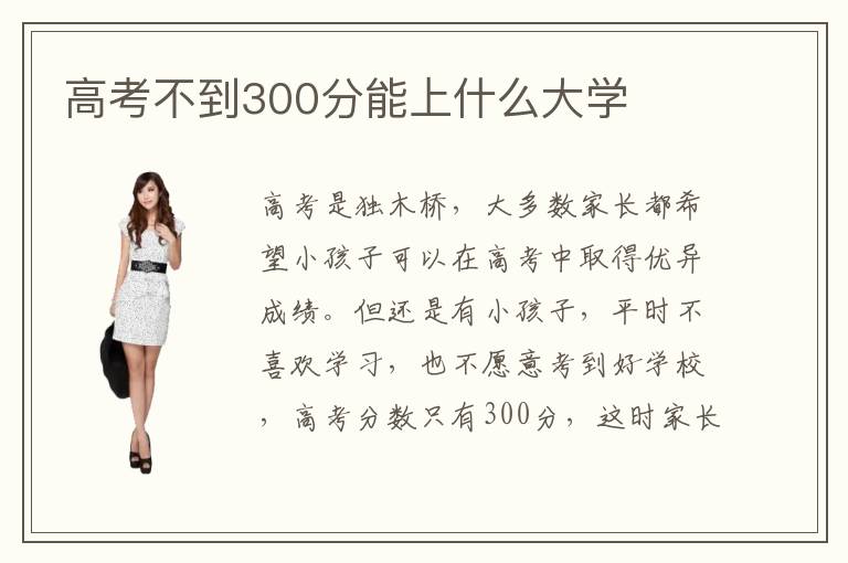 高考是独木桥,大多数家长都希望小孩子可以在高考中取得优异成绩。但还是有小孩子,平时不喜欢学习,也不愿意考到好学校,高考分数只有300分,这时家长有时候会特别焦虑不安。高考不到300分能上什么大学大专含金量,大学大专的含金量通常并没有本科高,专业水准还算不错,总体来说可以培养好的学生。高考不到300分能上什么大学哪些专业好,该选择热门的专业类型,包括计算机或者是设计专业等等。高考300分如果在选择大专的时候,还是非常明显的优势,那么就要针对性考虑自身的专业,包括设计专业,软件开发专业以及建筑专业等等,都属于技术类的工作类型,需要专业的知识和长时间的培训,才能够发挥职业的价值。大家要做好充分的吃苦准备,每一天都要有新的知识摄取。