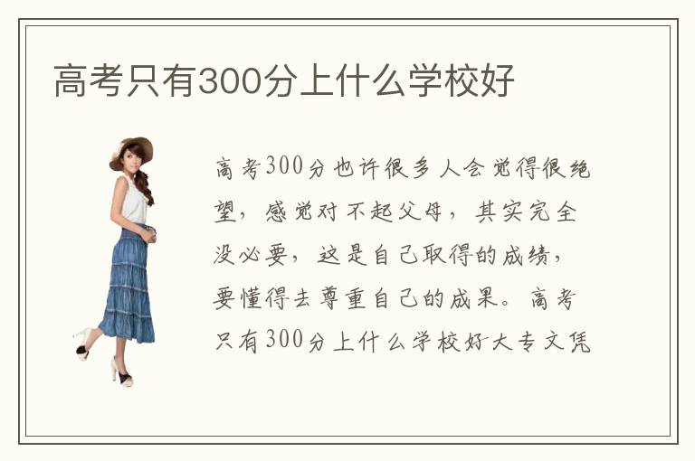 高考300分也许很多人会觉得很绝望,感觉对不起父母,其实完全没必要,这是自己取得的成绩,要懂得去尊重自己的成果。高考只有300分上什么学校好大专文凭有用吗,大专文凭,当然有很多用处,比如求职的时候是一种敲门砖,如果有能力,还可以进行专升本。高考只有300分上什么学校好怎么选专业,高考300分,可以选择国内排名比较靠前的专科院校,虽然是专科,但也有比较知名的排名榜,但大多数只能作为一种参考,另外有些排名榜也许是学校做出来的宣传。大专是很有必要的,大家要好好发展,虽然是没有太高的学历,也许在同类的竞争中会处于劣势状态,但正因如此,大家要努力学习,然后逆流而上,这样才能够跨过人生一道一道坎。相反,再从另外一个角度看,如果连学历的坎都跨不过去,那么未来人生的坎也非常难以跨越。