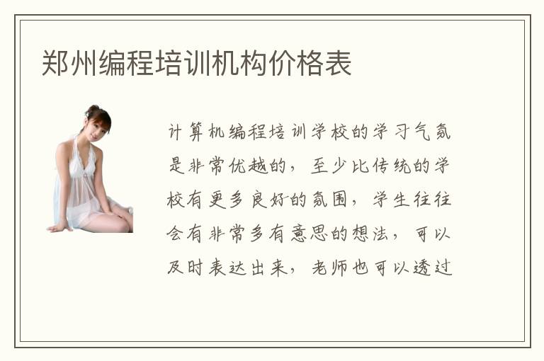 计算机编程培训编程培训学校的学习气氛是非常优越的,至少比传统的学校有更多良好的氛围,学生往往会有非常多有意思的想法,可以及时表达出来,老师也可以透过学生的各种表现,了解学生的基础以及兴趣点,然后再制定相应的计算机编程和各系列的软件课程内容。郑州编程培训机构价格表可能并不是完全一致的,要看编程培训机构教育经验以及课程技术衡量、教育口碑等等。编程培训机构口碑好不好,有些老师的能力比较强,而且也有不错的专业水平,还有大量辅导方法,尽快了解各种专业的辅导方法,以后就会有更强的计算机编程学习能力,也能减少各种学习的障碍,让学生在计算机编程方面有更强的水准,保持不错的就业优势和竞争优势,以后就不用担心计算机编程的能力比别人差的问题。