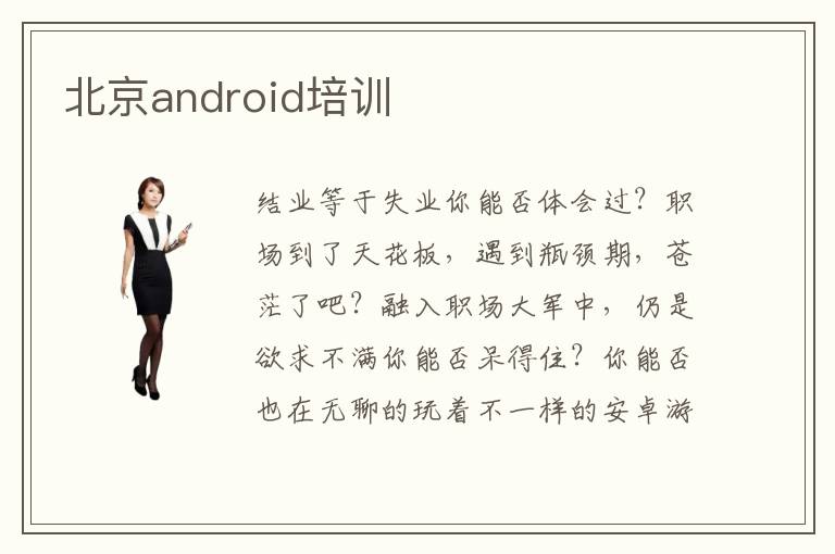 结业等于失业你能否体会过?职场到了天花板,遇到瓶颈期,苍茫了吧?融入职场大军中,仍是欲求不满你能否呆得住?你能否也在无聊的玩着不一样的安卓游戏来减轻无尽的使命压力?跟着Android琐细的运用变得愈来愈主要,从前Android将会迎来一个更加高速和动摇的打开,对于Android的运用人才的需求也日益增多。由此,北京android培训就变得热门,北京android系统培训受欢迎,北京android开发培训有用。Android软件职业绝对于传统的软件职业来说,是一个新式的产业。绝对于其它嵌入式软件来说,从业人员要少得多,因此公司Android软件人才方面紧缺,薪资待遇天然也要高于传统的计算机软件职业的人才。跟着Android嵌入式职业的快速打开,更多的世界名企的也开端把目光投入这一领域,一起Android也招引了世界大型公司的眼球,不断增加的工程师希望能够投入到这一赋有打开远景的专业领域。北京android培训的课程是一种全新的学习方式,对于全部学习的人来说可谓都是一个全新的体会。首要Android在线学习课程,添加了少数的用户体会元素,使学员在学习的进程能参与其间,添加了少数的互动,让学员有感同身受的觉得。Android在线学习平台还将学习和文娱相结合。让学员能够解脱以往学技能单调的觉得,学习的进程也是玩游戏的进程,晋级闯关,培养了学员的学习兴味,轻松学到知识。北京android培训很受用,而且北京android系统训练是高效的,北京android开发培训实用性强。开始是学员在学习的进程中,能够失掉全方位的学习教导。学员在学习的进程中,根据在线的虚拟空间,通过在线答疑和在线论坛,将自己遇到的成果提出,与此一起后台的开发老师会对学员提出的成果中止逐一解答。在论坛中我们对一些成果还能够打开讨论,并且有专业老师教导,这里集很多专家老师和学员与你一起交流学习,这种新的学习方式正在 Android训练打开学习与体会。