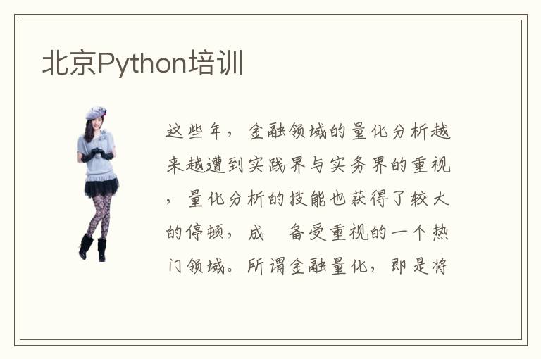 这些年,金融领域的量化分析越来越遭到实践界与实务界的重视,量化分析的技能也获得了较大的停顿,成爲备受重视的一个热门领域。所谓金融量化,即是将金融分析实践与核算机编程技能相结合,更爲无效的运用古代核算技能完结准确的金融资产定价以及生意机遇的发现。量化分析现在曾经触及到金融领域的方方面面,包含基础和衍生金融资产定价、危险管理、量化出资等。跟着大数据技能的展开,量化分析还逐步与大数据结合在一起,对海量金融数据完结无效和快速的运算与处置。北京Python培训很受期待和瞩目。大家都比较想知道北京地区Python培训如何、北京地区Python培训质量高吗这些问题。在量化金融的时代,选用一种适合的编程言语对于金融模型的完结是至关重要的。在这方面,Python言语体现出了不一般的下风,特别是它具有少数的金融核算库,并且能够供给与C++,java等言语的接口以完结高功率的分析,成爲金融领域快速开发和运用的一种要害言语,因为它是开源的,降低了金融核算的本钱,并且还通过遍及的社交网络供给少数的运用实例,极大的延长了金融量化分析的学习路径。作爲一个核算机初级喜爱者,还是比较喜爱接受北京Python培训,因为Python洁净利索,复杂直接。Python编写代码的速度非常的快,并且非常重视代码的可读性,非常适宜多人参加的项目。它具有了比曾经传统的脚本言语非常好的可重用性,维护起来也很便利。与如今盛行的编程言语Java、C、C++等相比较,异常是完结一个功用,Python编写的代码短小精干,开发的功率是其它言语的好几倍。所以假设你想尝试成爲次序员,Python将会是一个重要的挑选。北京作为优秀的城市,北京Python培训发展状态好。北京地区Python培训如何?北京地区Python培训质量高吗?