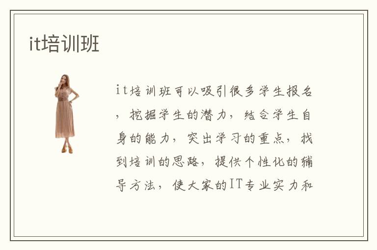 it培训班可以吸引很多学生报名,挖掘学生的潜力,结合学生自身的能力,突出学习的重点,找到培训的思路,提供个性化的辅导方法,使大家的IT专业实力和应用水平有比较大的突破。it培训班严格么,IT培训班有严格的辅导内容,每个阶段都会布置详细的规划和任务,也会拥有严格的监督。假如学生喜欢上课开小差,上课不认真听讲,老师往往马上急于纠正。it培训班有哪些优势,IT专业培训班当然有很多优势,首先就是排除各种学习的干扰,因为老师会营造很好的氛围,提供非常安静舒适的学习环境,使大家都避免受到外界的干扰。另外,专业补习班有细致的教学方案和培训内容,每个阶段都会有重要的目标和课程规划,有助于学生谨慎把握重点,解决这些难点,得到比较理想的成绩。