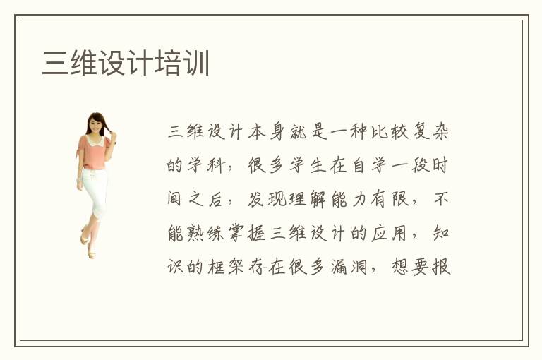 三维设计本身就是一种比较复杂的学科,很多学生在自学一段时间之后,发现理解能力有限,不能熟练掌握三维设计的应用,知识的框架存在很多漏洞,想要报名参与三维设计培训的课程。三维设计教学方法比较丰富,比如远程辅导、1对1辅导、小班辅导等等。这些辅导方案可以结合学生的需要,采用个性化的补习措施,让大家得三维设计能力更强,从而体现出三维设计培训效果。当然,学生自己要认真去对比,关注不同学习方法,了解各方面的学习任务。除了理论知识之外,还应多关注应用知识领域的内容,如果只有理论的积累,缺乏良好的应用,培训效果还能得到体现。另外,在学习中也应该有独立的思考,自己去挖掘更多深层次的知识领域,不要依赖老师以及三维设计补习班。