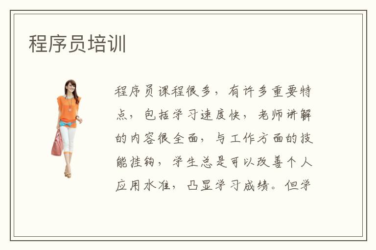 程序员课程很多,有许多重要特点,包括学习速度快,老师讲解的内容很全面,与工作方面的技能挂钩,学生总是可以改善个人应用水准,凸显学习成绩。但学生在学习时,应该把握住学习的目标方向,关注更多具体的思路,积极做好自己的总结,如果实在没有办法,可以考虑程序员培训课程,相信会有许多改善的空间。程序员培训专业吗,程序员培训机构有很好的课程内容,每一种课程都已经过老师的严格筛选,提供专业的个性化教学方案,收获往往更加显著。程序员培训方式比较多,包括1对1教学、线上教学以及上门教学等等,许多学生缺乏应用的培训,没有良好的学习基础,经验不够多,课程也不够完善,经过老师的细致指导后,进步空间更大,学习目标更加明确,改善效果更好。