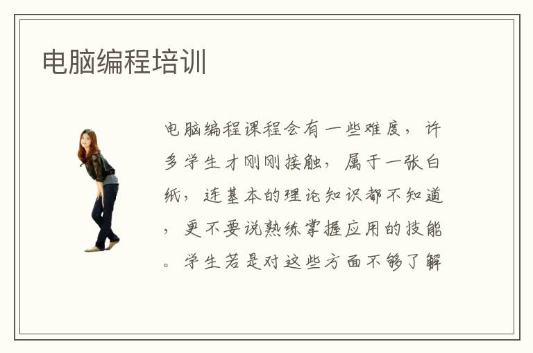 电脑编程课程会有一些难度,许多学生才刚刚接触,属于一张白纸,连基本的理论知识都不知道,更不要说熟练掌握应用的技能。学生若是对这些方面不够了解,希望有更多突破,一方面可以投入更多时间,通过自学的方法,熟练运用各种知识内容。另外,也可以参与电脑编程培训课程,提高学习效率,制定明确的学习规划,发挥更理想的学习成果。电脑编程培训能提高就业率吗。电脑编程培训班当然可以提高就业率,因为培训班很重视学生的工作技能,在不同阶段的设置对应性的辅导课程,使学生的操作能力和应用水准拥有更大的突破。电脑编程网络教学确实对很多学生都是非常重要的,因为可以节约很多学习时间,大家可以灵活安排,并不用担心时间不足或效率不高等等情况。