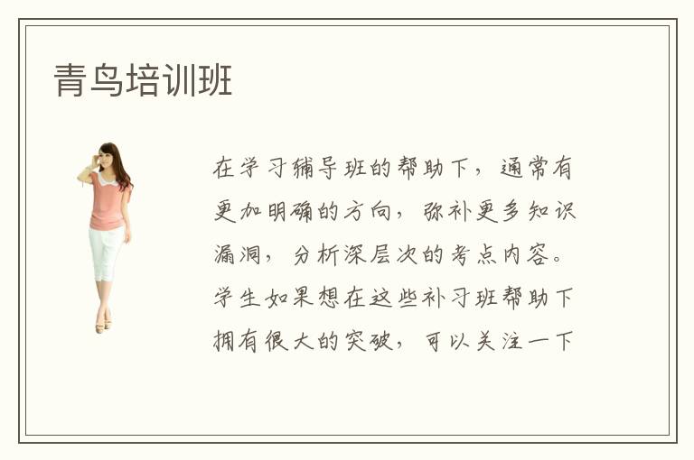 在学习辅导班的帮助下,通常有更加明确的方向,弥补更多知识漏洞,分析深层次的考点内容。学生如果想在这些补习班帮助下拥有很大的突破,可以关注一下青鸟培训班专业课程以及教学方案、培训设施、学习成果等等。部分补习班的资源确实不够多,配套设施不够齐备,学生的应用水准不够高,往往会对这些机构不满,甚至给出负面的评价,学生要谨慎关注。青鸟培训班多少费用,可能在2000~6000,但事实上学生的报名课程难度不同,时间等等会变化,所以预算有差别。青鸟培训班补习形式相当多样,比如如今大家很喜欢的网络培训方案,大家通过互联网的方式,在家里利用手机或iPad、电脑等等即可上课,而且学习时间比较短,但老师讲课的内容相当全面,基本不存在培训漏洞。