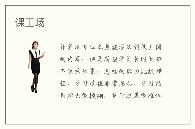 计算机专业本身就涉及到很广阔的内容,但是有些学员长时间都不注意积累,总结的能力比较糟糕,学习过程非常混乱,学习的目标也很模糊,学习效果很难体现。为了保障学习优势,学生要谨慎对待各种培训课程,积累更多的经验,分析未来发展方向。如果觉得学习的难度有点大,可以参考一些靠谱的补习班,比如课工场,对以后的学习和竞争都有一点点帮助。课工场要多长时间,3个月到4个月左右,部分学生学习进展有点慢,可能要适当放慢学习脚步,延长学习时间。课工场课程压力大不,课工场培训机构有完善的教学课程,每个阶段都有重要的内容培训,压力不会太大,值得大家作为一个值得选择。但学生报名之前,应该要关注不同培训班的教学质量以及培训的方式、所在地区的教学资源等等。