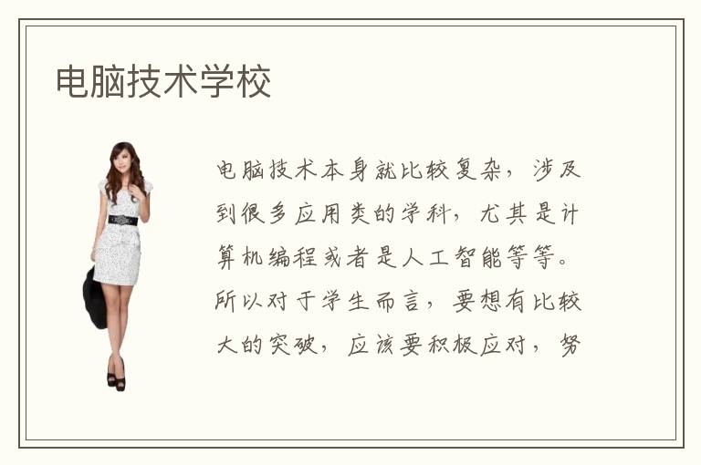 电脑技术本身就比较复杂,涉及到很多应用类的学科,尤其是计算机编程或者是人工智能等等。所以对于学生而言,要想有比较大的突破,应该要积极应对,努力争取学习机会,发挥更理想的水平。而有些学生会选择电脑技术学校,由老师来布置全面的课程,分析各个阶段的重要领域,通过多方位的学习,提高成绩和学习的质量。电脑技术好吗,大多数电脑技术培训辅导班都有完善的课程,帮助学生缓解学习压力和紧张感。电脑技术学校可信吗,电脑技术学校可信,主要是知名度比较高,多数学校的教学水准都很不错,学生在报名之前,可能还只处于零基础的水平,但报名之后,经过一系列的辅导和培训,老师将多年的解题经验和学习思路呈现给学生,学生的进度会快速上升,从而精通各种教学课程。