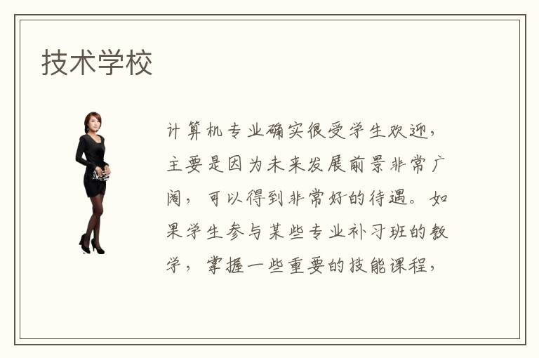 计算机专业确实很受学生欢迎,主要是因为未来发展前景非常广阔,可以得到非常好的待遇。如果学生参与某些专业补习班的教学,掌握一些重要的技能课程,有助于发挥很好的学习效果,学习体验更丰富。而如今技术学校越来越多学生要重视各种技术学校的选择方法,关注学习的技巧,考虑清楚不同学校的能力、专业水平、学习优势等等,综合进行比较。技术学校指导要求比较严格,首先要关注前沿知识,积累重要的基础和未来的应用。技术学校收费情况可能是3000~4000元,其实大家的学习水准和学习时间等等都会变化,费用方面会有一点点差异。老师往往会提供个性化的教学方法,真正达到因材施教以及分层学习,所以学生要珍惜这些机会,关注自身薄弱环节,选择合适的指导方案。