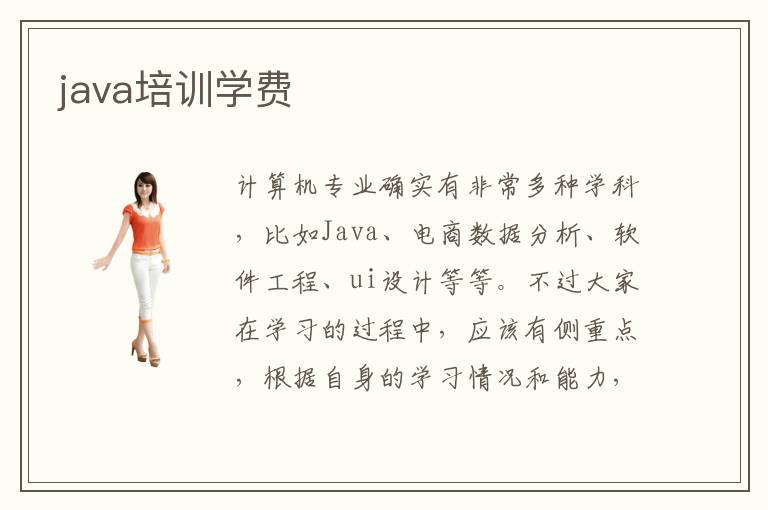 计算机专业确实有非常多种学科,比如Java、电商数据分析、软件工程、ui设计等等。不过大家在学习的过程中,应该有侧重点,根据自身的学习情况和能力,找到对应性的辅导方法,有条不紊掌握更多知识内容。假如学生不懂得这些课程,可以报名某些知名教学机构,找到合适的培训方案,从而发挥理想的学习成绩。java培训学费大概是2000~6000元,但这些只是一个普遍范围,主要是课程内容不同,教学质量和时间不太一样,课程费用存在一点点差异。所以大家要认真做准备,了解不同的课程的收费情况以及教学质量。java入门指导有多种作用,帮助学生巩固基础,慢慢适应补习班的学习节奏。java培训机构选择方法主要从几个角度出发,包括应用水准以及教学资源、师资力量。