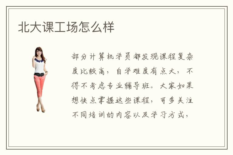 部分计算机学员都发现课程复杂度比较高,自学难度有点大,不得不考虑专业辅导班。大家如果想快点掌握这些课程,可多关注不同培训的内容以及学习方式,找到较靠谱的培训类型,收获满意的学习效果。另外,一般情况下,补习班的学生还应该要投入更多时间和精力,认真总结,不要总是三天打鱼、两天晒网,或者急于求成。北大课工场怎么样,一方面在于知名度高,有完善的教学形式,也关注学生的兴趣,制定明确的目标,学习成绩拥有显著变化,另外一方面在于北大课工场补习方式非常丰富,包括远程教学、个性化的一对一教学等等,充分体现出北大课工场技术水平,短时间内得到非常好的学习效果。当然,老师会结合学生进展,调整学习速度,让学生的接受的效果更好。