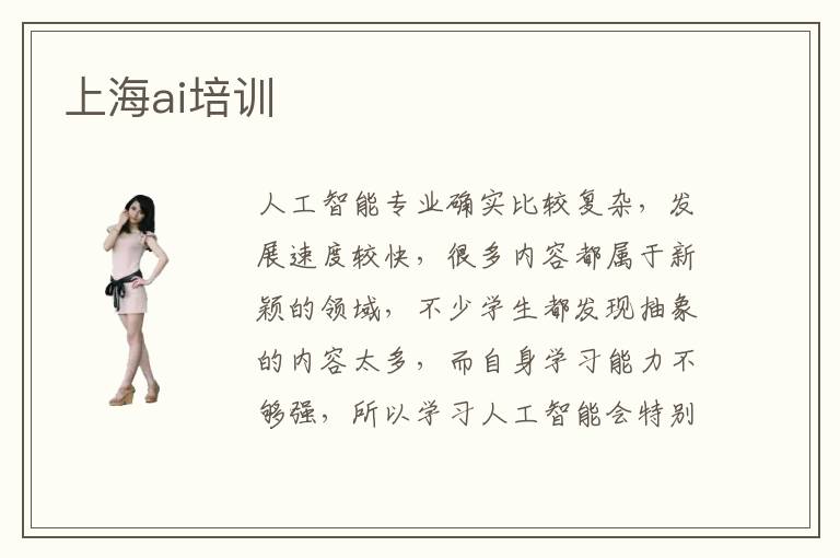 人工智能专业确实比较复杂,发展速度较快,很多内容都属于新颖的领域,不少学生都发现抽象的内容太多,而自身学习能力不够强,所以学习人工智能会特别吃力。不过学生可以考虑报名上海ai培训学校,有很多老师都有多年教学经验,了解学生在人工智能专业方面的薄弱环节,通过强化训练的方法,补充专业方面的不足之处。ai培训氛围如何,人工智能辅导班的教学氛围很不错,老师提供实践训练的设备,提供许多真实的企业应用场景,学生在掌握的过程中,可以对这些所学的知识更加具象化。ai培训时间可能是两个星期到三个月,但时间还不固定,主要看学生的理解能力以及学习的目标、基础水平等等。假如基础很薄弱,可能要投入许多时间才能成为一些简单的入门知识。