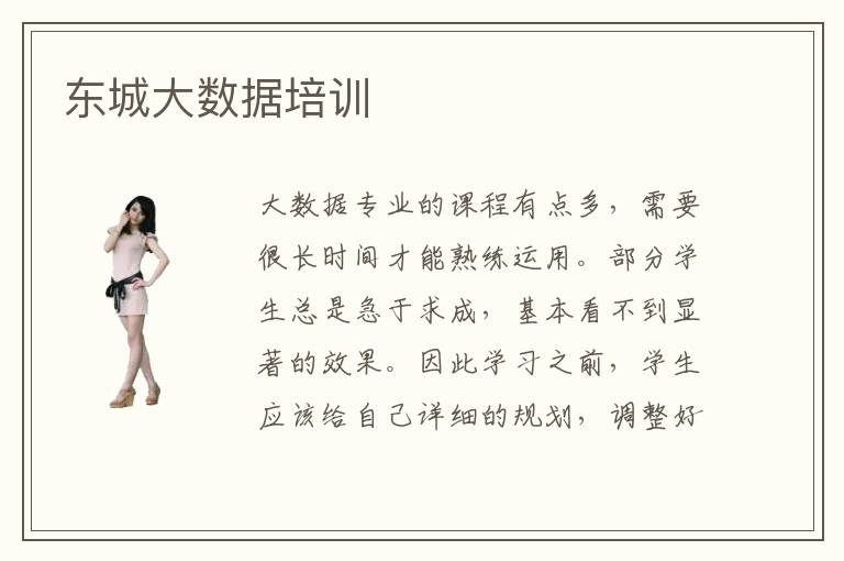 大数据专业的课程有点多,需要很长时间才能熟练运用。部分学生总是急于求成,基本看不到显著的效果。因此学习之前,学生应该给自己详细的规划,调整好学习动力和态度,认真安排学习时间,在规定时间内完成各项任务。要是觉得学习压力有点大,可以参考东城大数据培训的课程,老师会通过轻松的教学方法,让大家熟练运用这些课程。大数据培训严不严,大数据培训机构的课程相对严格,老师也很严谨的教学思路和培训方案,分析各种解题的难点和学习技巧,真正做到将所学知识点融会贯通。大数据培训多久,大数据培训机构的时间可能在1个月到4个月之间,但是部分专业辅导机构的课程不太一样,培训的时间安排有差别,要是大数据专业辅导难度要大,培训时间会有所延长。