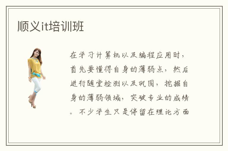 在学习计算机以及编程应用时,首先要懂得自身的薄弱点,然后进行随堂检测以及巩固,挖掘自身的薄弱领域,突破专业的成绩。不少学生只是停留在理论方面,没有真正开拓视野,掌握更多计算机的应用知识,学习的效果很难保证。为了体现出IT学习质量和效果,学生可关注顺义it培训班,了解更多应用IT课程的方法和思维。it培训班小班课程非常受欢迎,因为小班教学的针对性很强,制定很多细致的方案,由老师制定考试的大纲,每一位学生的进度都能得到不错保障,因此学习压力更低。it培训班多人吗,计算机专业辅导机构的报名人数很多,热度非常高,主要是这些学校能提高学生的综合能力和职业素养,结合企业的要求进行课程的强化训练,真正达到实践和练习相结合的学习目标。