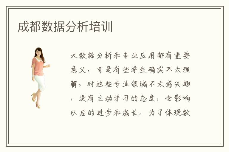 大数据分析和专业应用都有重要意义,可是有些学生确实不太理解,对这些专业领域不太感兴趣,没有主动学习的态度,会影响以后的进步和成长。为了体现数据分析的专业课程优势,学生要努力突破,掌握一些基础应用技能,然后一步一步进行优化。当然也有部分学员觉得学习数据分析课程的过程太漫长,自学的效果不够理想,不得不考虑成都数据分析培训。数据分析培训任务难吗,数据分析辅导机构的任务不难,很多学生会尽可能在几个月之内熟练运用和掌握,学习效果相当让人满意,获得优越的数据分析培训成绩。其实有一些学生对自己的数据分析学习效果感到失望,总是觉得不如其他成绩优秀的同学,其实经过辅导班的数据分析教学和系统训练后,学习成果会快速得到保障。