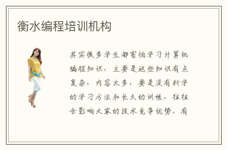 其实很多学生都害怕学习计算机编程知识,主要是这些知识有点复杂,内容太多,要是没有科学的学习方法和长久的训练,往往会影响大家的技术竞争优势。有些学生感觉学习压力以及负担很重,学习进度很慢,没有办法将多种编程解题的思路和方案掌握起来,面临许多困境和难题。其实学生有类似困境的情况下,可选择衡水编程培训机构,老师会将一些重要的计算机编程学习方法和途径告诉大家,从而享受其中的学习过程。编程培训机构哪些好,要挑选编程培训机构,应该考虑的是教育水准、专业设计方案、课程教学内容等等,综合进行考虑。有的学校有大量的辅导课程,科学安排学习时间,减少学生在应用过程可能存在的负担,所以学习起来会更容易看到编程培训机构成果。