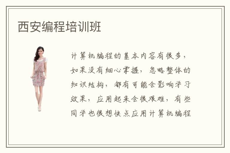 计算机编程的基本内容有很多,如果没有细心掌握,忽略整体的知识结构,都有可能会影响学习效果,应用起来会很艰难,有些同学也很想快点应用计算机编程的知识,设计出自己想要做的程序,完成一些工作的任务和目标。因为没有系统训练和应用,所以会很困惑,无从下手。为了解决这些情,况同学可以考虑西安编程培训班,由老师安排教学方案,完成计算机编程的内容。编程培训班如何选,首先要考虑学习内容、学习方法以及课时间安排等等,有些同学选一些劣质的辅导班,没有良好的学习方法,时间安排也比较紧急,导致同学没办法完成这些课程。编程有哪些用途,可以完成各项项目设计,提高软件系统的应用水准,而且掌握不同的编程语言,就可以完成各种类型的程序设计。