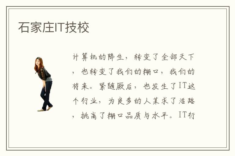 计算机的降生,转变了全部天下,也转变了我们的糊口,我们的将来。紧随厥后,也发生了IT这个行业,为良多的人某求了活路,挑高了糊口品质与水平。IT行业,社会需求量大,且待遇好,这也就吸收了愈来愈多的宅男学习相干专业,将来走向IT的途径。要想挣很多,首先就要学的好,要想学的好,那末就要选择一所各方面前提都非常硬气,本身又能完整顺应的IT技校。这里有着对石家庄IT技校的细致介绍,赐与您做恰当的参考。石家庄IT技校推荐电脑学校