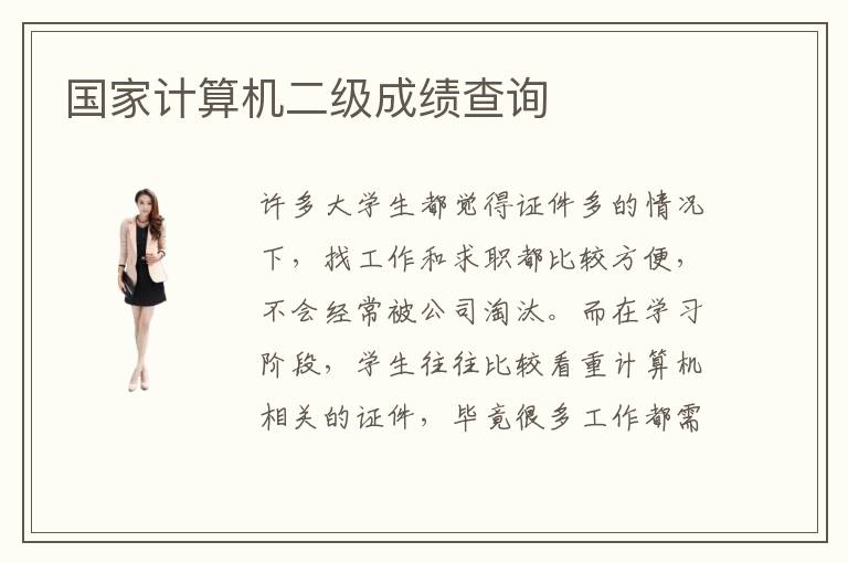 许多大学生都觉得证件多的情况下,找工作和求职都比较方便,不会经常被公司淘汰。而在学习阶段,学生往往比较看重计算机相关的证件,毕竟很多工作都需要计算机办公软件的应用。要是感兴趣,不妨了解一下计算机二级考试,这些考试内容比较基础,涉猎范围也比较广,学生在备考期间,可以得到充分的提高,掌握计算机应用的技能。国家计算机二级计算机二级成绩查询可以通过信息查询和电脑查询的方法,比如三月的考试,一般成绩是在5月份左右出,同时也可以通过网站搜索一下成绩公布时间,然后填写相关的信息,查询自己的分数。国家计算机二级备考阶段,要很重视基础的应用,然后在规定时间内掌握重要的知识。而且需要注意的是,了解计算机二级报名的时间,不要错过报名的时间。
