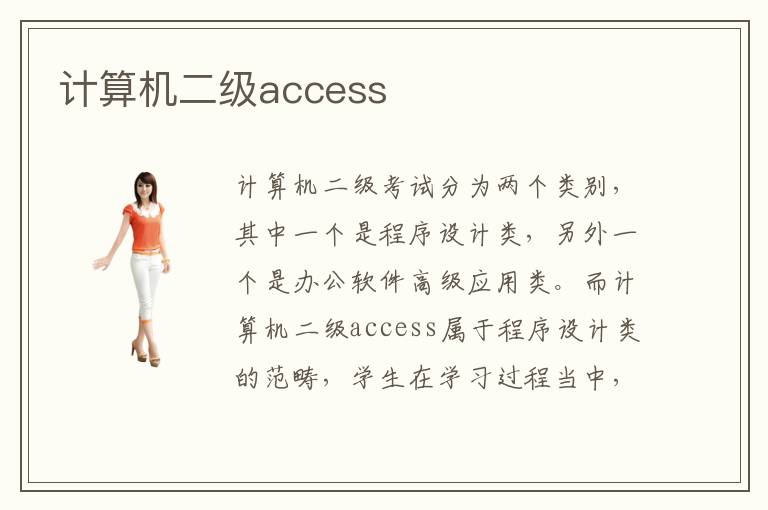 计算机二级考试分为两个类别,其中一个是程序设计类,另外一个是办公软件高级应用类。而计算机二级access属于程序设计类的范畴,学生在学习过程当中,应该针对这些考试的类型,选择合适的教材,认真做好复习工作,扫除一些知识难点。计算机二级access如何准备,首先要制定明确的目标和学习规划,然后再合理安排好时间,针对学习的目标进行专业的复习。另外成绩不太好的情况下,可以参加计算机二级access学校,因为这些学校可以针对零基础学员进行一个深入的培训,也会帮助大家更快理解计算机二级考试的重点范围,结合多年的辅导经验,使大家进步的速度加快。不过学校也是有局限性的,比如培训时间比较多,同学可能学习的时间很短,导致复习的效率不高。