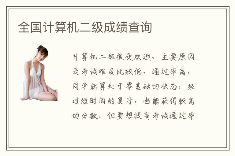 计算机二级很受欢迎,主要原因是考试难度比较低,通过率高,同学就算处于零基础的状态,经过短时间的复习,也能获得较高的分数。但要想提高考试通过率,就应该多投入时间,深入研究考察范围,关注整个行业的动态、以及每年计算机考试知识的重点、出题的方向以及考察思路。全国计算机二级计算机二级成绩查询可在网上查询或者短信查询,查询速度都很快。全国计算机二级的课程优势非常丰富,若学生备考的时候,没有做好充分了解,可以报名一些相关的辅导机构,一方面有老师作为指导,效率会更高,另外一方面是水平更有保障,学习内容更加全面,可以解决很多学习难题。计算机二级的应用要求比较多,所以学生不仅要学习书本知识,也要重视老师介绍的知识应用过程。