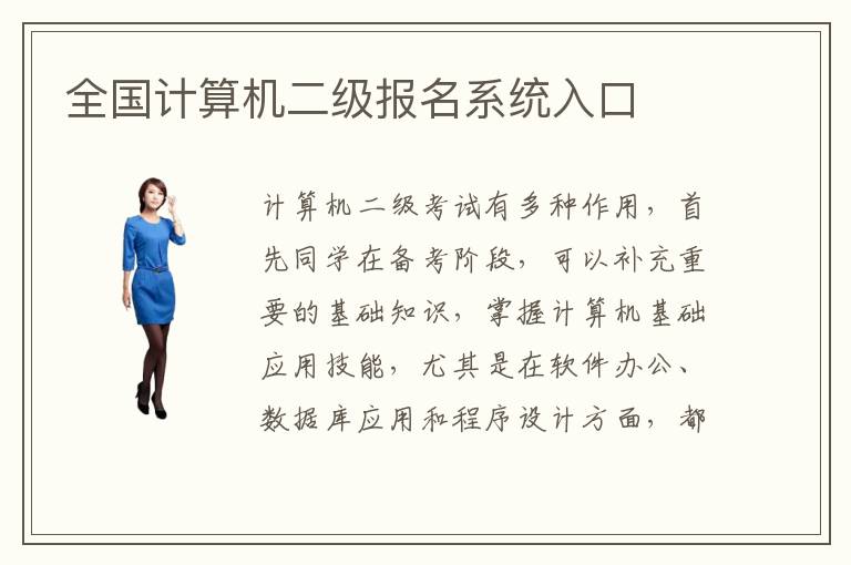 计算机二级考试有多种作用,首先同学在备考阶段,可以补充重要的基础知识,掌握计算机基础应用技能,尤其是在软件办公、数据库应用和程序设计方面,都会有许多提升。不过同学不要认为计算机二级考试很简单,就不注意复习,因为二级考试涉及到许多基础的专业知识,这些专业知识都需要同学认真理解,掌握其中的概念和应用方法。在报名规定的时间内,学生要搜索全国计算机二级计算机二级报名系统入口,然后完成报名的整个流程。计算机二级要准备多久,多数学生的准备时间是2个月到4个月,但事实上每个同学的能力都不太相同,基础也不太一样,所以备考时间也有变化。全国计算机二级通过率高不高,计算机二级考试的通过率相当高,许多同学在短期内备考取得好成绩。