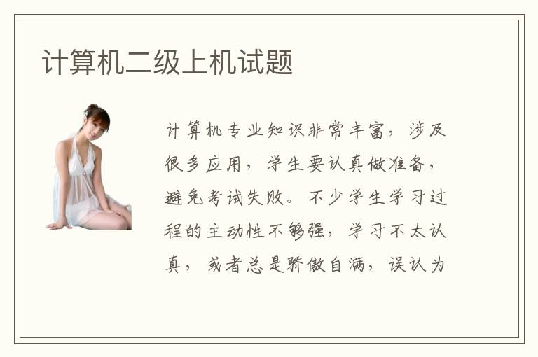 计算机专业知识非常丰富,涉及很多应用,学生要认真做准备,避免考试失败。不少学生学习过程的主动性不够强,学习不太认真,或者总是骄傲自满,误认为计算机考试太简单,自己能随随便便取得高分。同学在准备过程中,要多做题目,关注计算机二级上机试题,了解考察范围和重要的考察方向、出题思路等等。计算机二级补习班多不多人报考,计算机二级考试补习班报名人数相当多,许多老师都有严谨的学习方向,复习的过程清晰的思路,每一位老师都有专业的水平,只要学生参加这些补习班,成绩会好一点点,学习过程也比较轻松,不会担心有太多压力。计算机二级报名途径一般是考虑网上报名和线下报名,网上报名只需要登录网站,然后在指定时间内完成报名的流程便可。